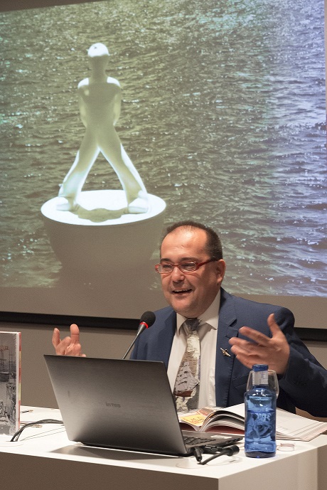 Presentación del libro Barcelona Antigua en Barcelona, año 2017; al fondo, el Miraestrellas.