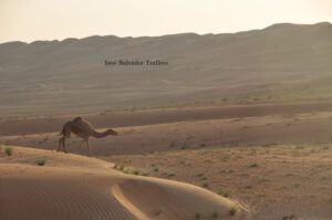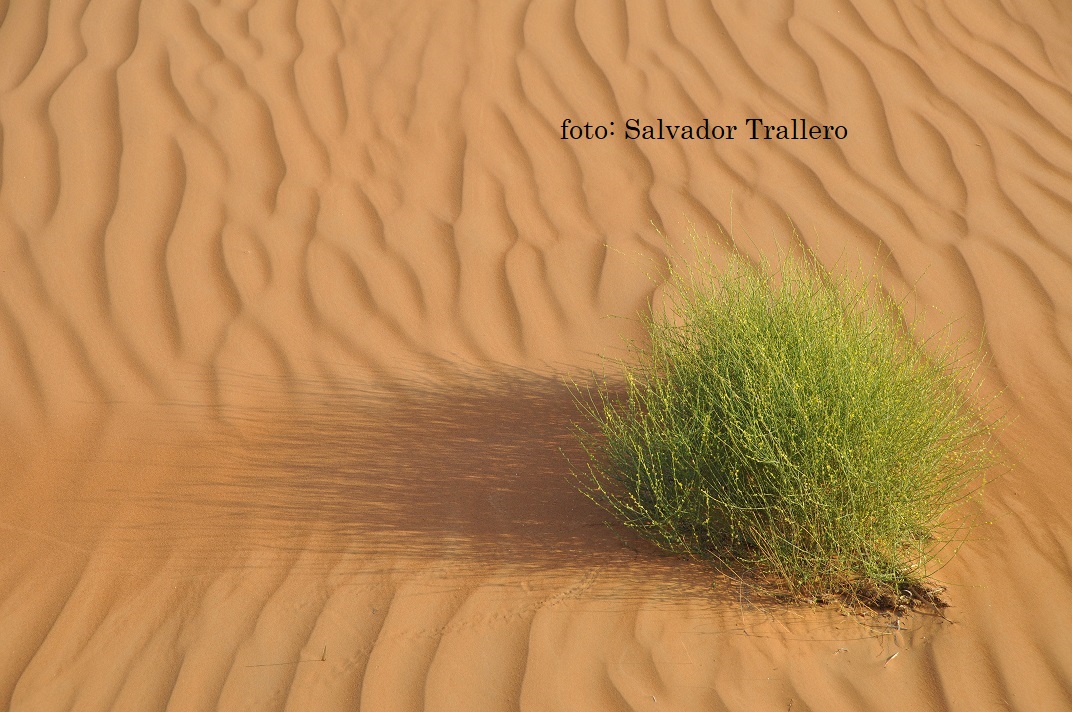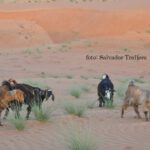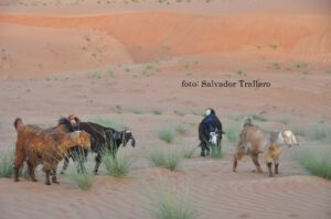 En los umbrales del desierto, salpican las dunas y planicies de arena algunos brotes verdes de pequeñas plantas y arbustos, que apenas sirven de alimento a reducidos rebaños de cabras y algunos camellos, que no se alejan demasiado de improvisados abrevaderos que rellenan de agua los propietarios y pastores cada pocos días.
