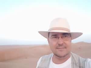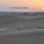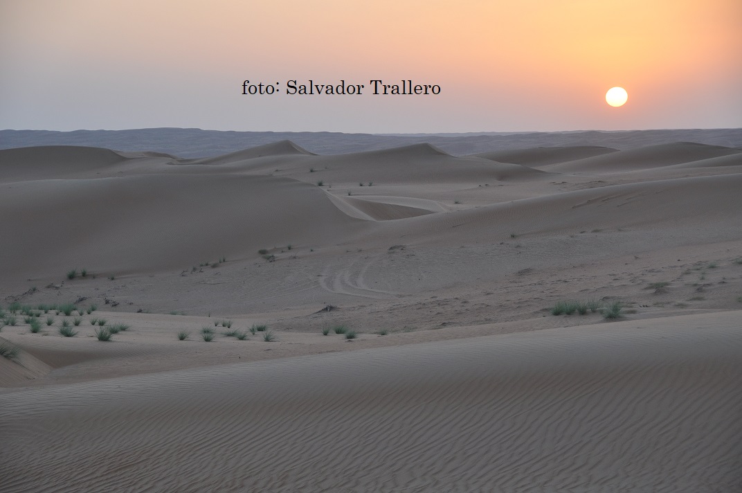 Atardece en las doradas arenas del desierto. Sedosos y minúsculos granos de arena forman las miles de dunas de todos los tamaños que se extienden hasta cubrir el lejano horizonte; y en sus puntas, el ligero y cálido viento mueve las crestas de arena, creando ondulaciones que sombrean el paisaje en las últimas luces del día, cuando los colores se suavizan tornando a unos tonos ligeros que se van apagando con el paso de los minutos, el sol cae rápido en los confines del mundo.