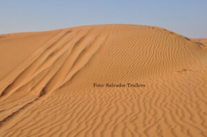 Llegué al desierto de arena tras visitar la ciudad costera de Sur, donde, cuenta la tradición, nació el célebre y recordado viajero de nuestras lecturas infantiles y juveniles Simbad el marino; con miles de kilómetros de extensión, Wihiba Sands es uno de los desiertos de arena más grandes del mundo, que cada año crece y arrebata tierras yermas a la estepa omaní. El aire es cálido, pero no hace excesiva calor en Omán en noviembre, nada que ver con los 45º a los que se llega en los meses de junio a septiembre, y en los que de una a cinco del mediodía, la actividad en las ciudades casi llega a paralizarse por completo, con el cierre de los comercios, cafés y restaurantes, y la interrupción del transporte público. También allí hay siesta.
