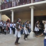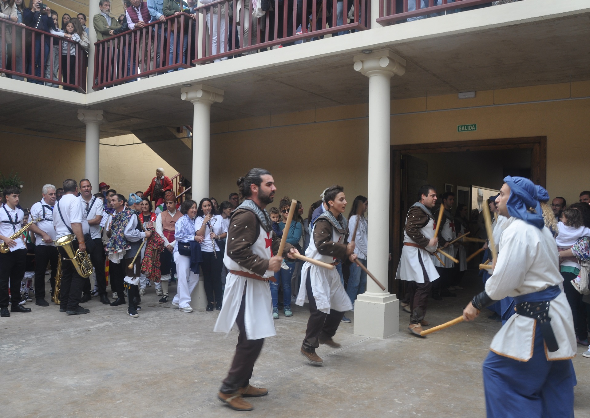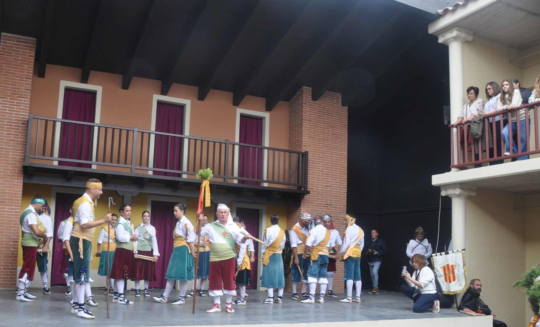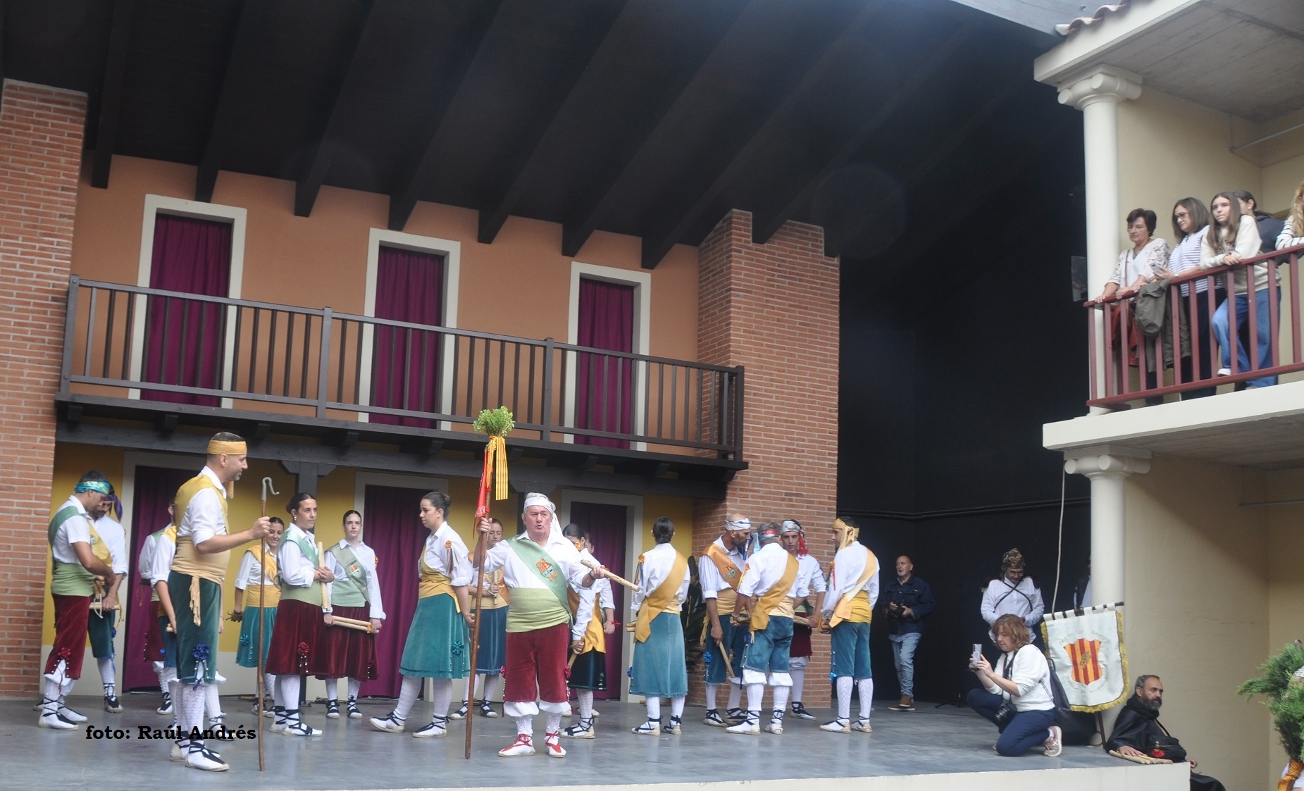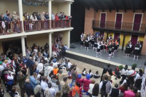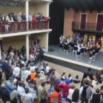 Comenzó, conforme al horario previsto, el pasacalles por la localidad, con un recorrido en el que a lo largo de una hora los grupos evolucionaron al son de sus melodías, terminando en un escenario de lujo, el Corral de Comedias de Robres, donde en una emocionante llegada, todos los grupos entraron danzando, con su vibrante y sonoro paloteo que resonó entre los pilares, galerías y platea de este monte Parnaso del teatro monegrino; los acompañantes fueron accediendo y llenando las galerías superiores del edificio, mientras que el patio se llenaba de danzantes, músicos y personajes de la teatralización: generales turcos y cristianos, ángeles, mayorales, rabadanes y Diablos; colgada en una balconada, la lona con todos los nombres de los Dances monegrinos saludaba a los recién llegados, que fueron abarrotando el espacioso  interior.